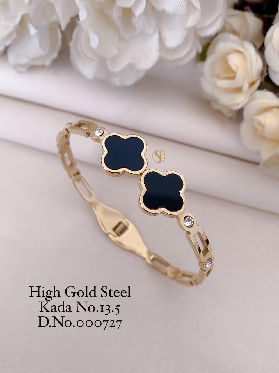This kada features two jet-black enamel four-leaf clover charms framed in gold, symbolizing luck and elegance. Accented with clear stones on the band, it blends charm with a sleek modern aesthetic.